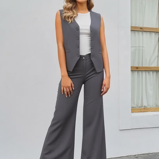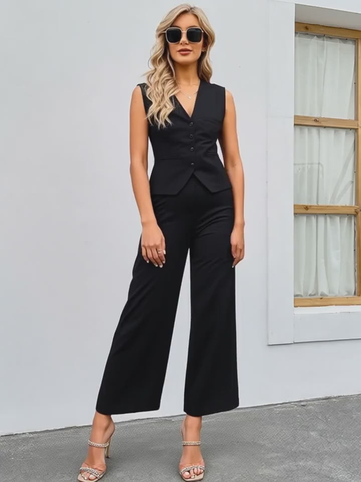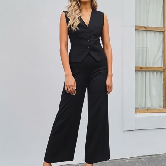 L'outfit è un completo da donna in due pezzi, composto da un gilet e un paio di pantaloni, entrambi di colore nero.