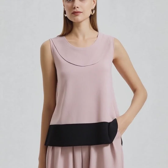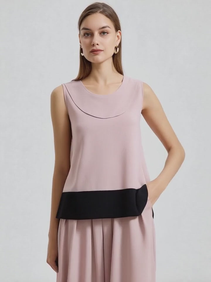 La canottiera ha un taglio dritto e leggermente ampio, con una linea pulita e senza maniche. Il colore principale della canottiera è un rosa tenue e delicato, che si avvicina a un rosa cipria o un rosa antico molto chiaro. La sua caratteristica più evidente è la fascia orizzontale di colore nero che attraversa il bordo inferiore della canottiera. Questa fascia crea un forte contrasto visivo e dona un tocco grafico e moderno al capo, simulando quasi una sovrapposizione . Lo scollo è semplice e rotondo, e il tessuto sembra essere liscio e compatto.