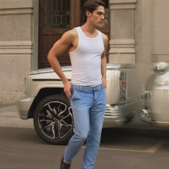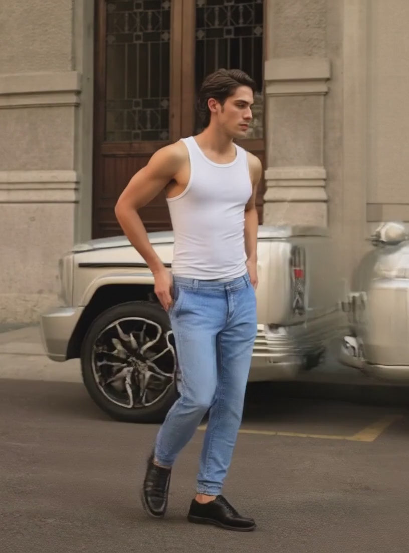I jeans raffigurati sono un modello da uomo che presenta una vestibilità moderna e confortevole. Il tessuto è un denim di colore azzurro chiaro, con lavaggio che conferisce un effetto leggermente vissuto, più evidente sulle cosce e nella parte posteriore sopra le ginocchia, creando delle sfumature e pieghe naturali.