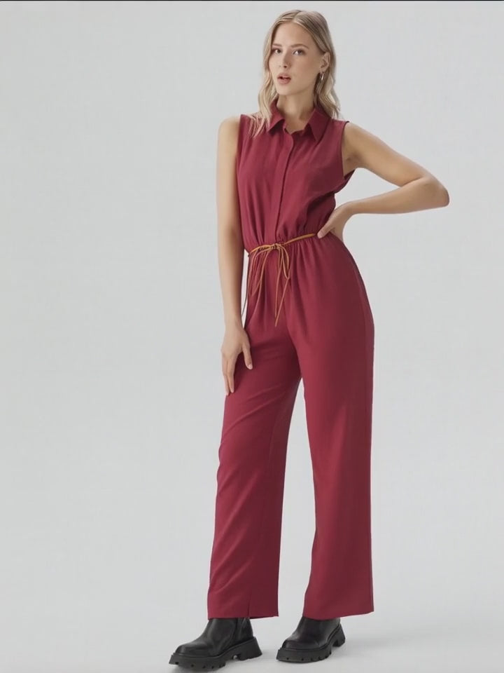 Il design presenta un raffinato colletto a camicia e una chiusura a bottoni nascosta lungo il corpetto, che conferisce un tocco di sofisticazione. Le maniche sono assenti, rendendo il capo ideale per le stagioni più calde o per essere stratificato. La vita è definita da una sottile cintura in corda intrecciata di colore marrone chiaro, che aggiunge un elemento bohémien e permette di stringere la tuta per creare una silhouette più definita.