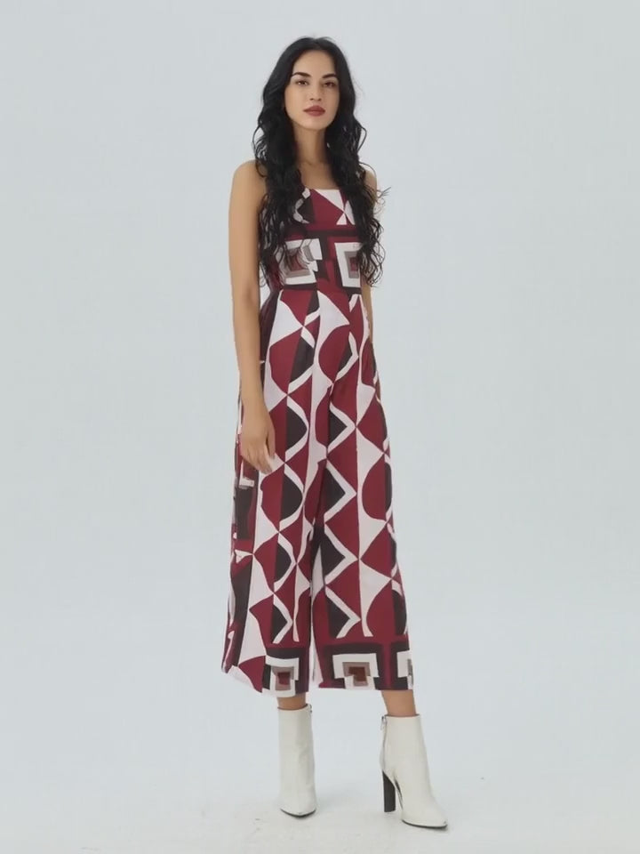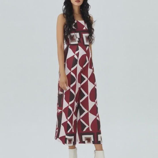 Il cuore di questa jumpsuit risiede nella sua fantasia geometrica esclusiva, un'armonia dinamica di forme e colori che cattura immediatamente lo sguardo. Blocchi di colore pieni, diamanti e motivi astratti si fondono in un design contemporaneo, dominato da ricche tonalità di bordeaux/marrone, bianco crema e sfumature terrose, che creano un contrasto vibrante e sofisticato. Questo pattern audace non è solo una stampa, ma un'opera d'arte indossabile che ti farà brillare in ogni occasione.